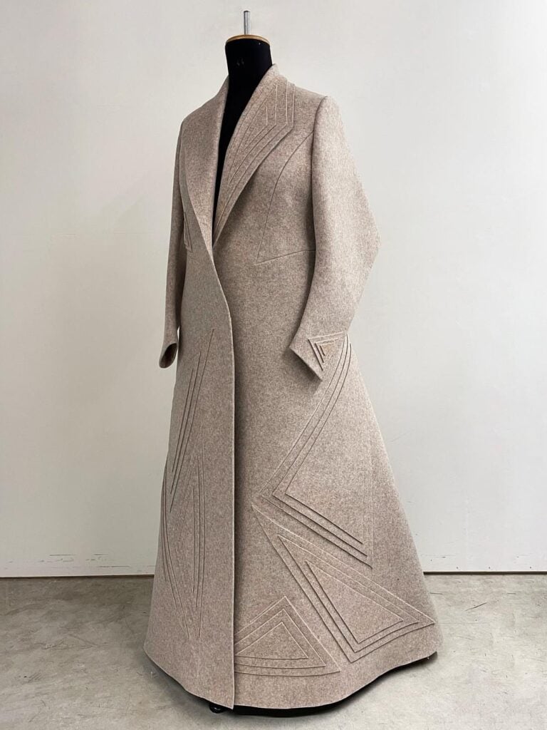 From entire costumes built around geometric silhouettes or layers of sculptural elements, to one-of-a-kind jackets with exaggerated collars, cuffs and lapels, it’s clear that many of Kramp’s pieces cannot be made from an existing pattern. Their singular design must be underpinned by bespoke construction.