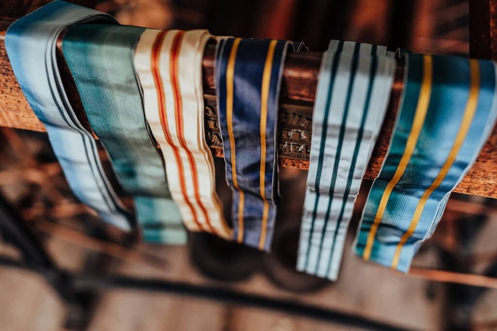 “It’s usually done with a ribbon loom, which weaves ribbons that are not much more than maybe three inches wide,” says Bye, “but we’re unusual in that we weave ours in a broadcloth, as a full width of about 14 ribbons with little gaps in between, and a special extra inserted warp yarn that gets twisted around the edges to create a tiny selvedge along each ribbon.